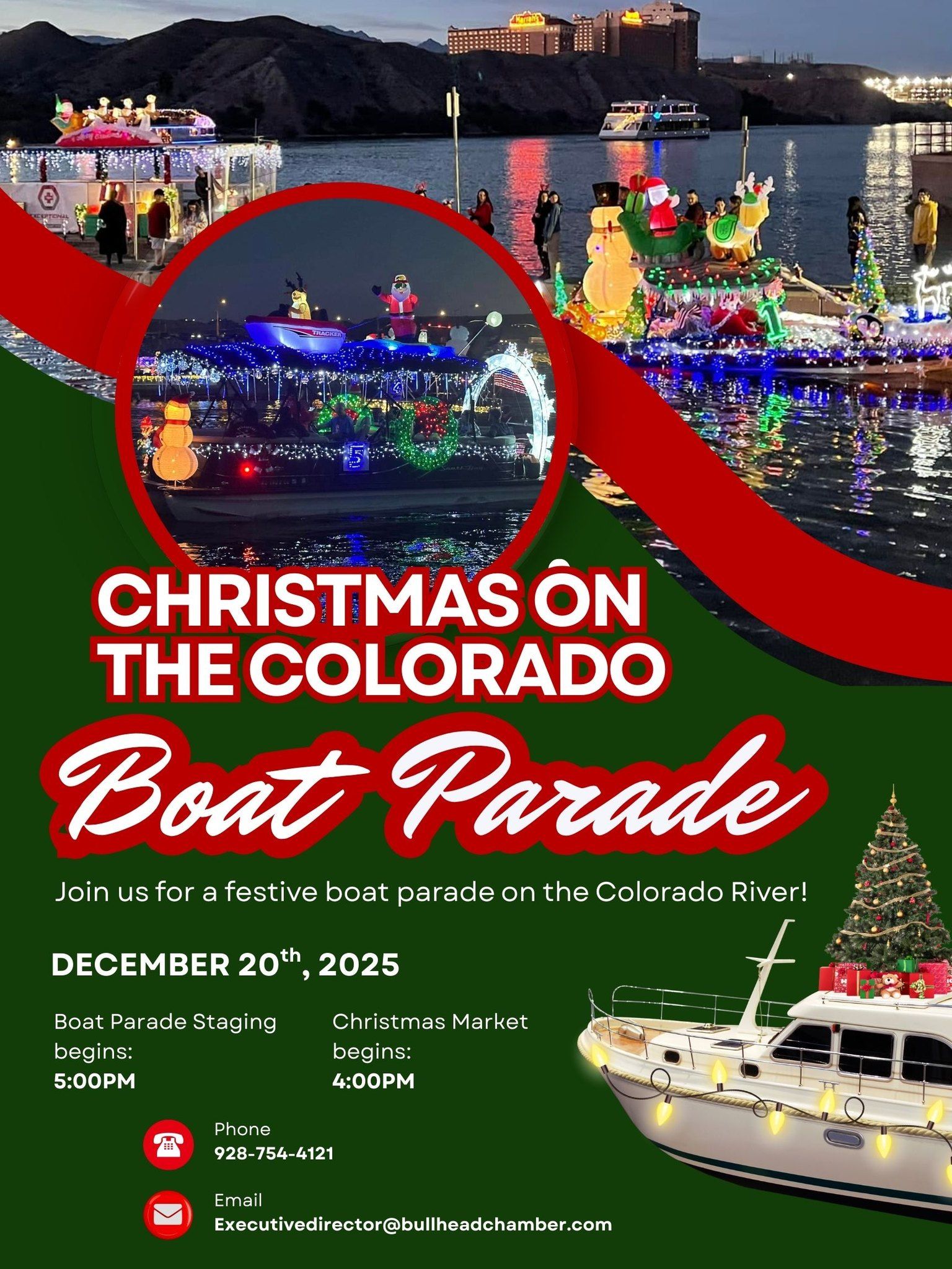 Christmas on the Colorado, a holiday celebration unique to our natural environment, aims to create a family fun event with pretty boats and an awesome event on land with music, a Christmas market, Santa and more!